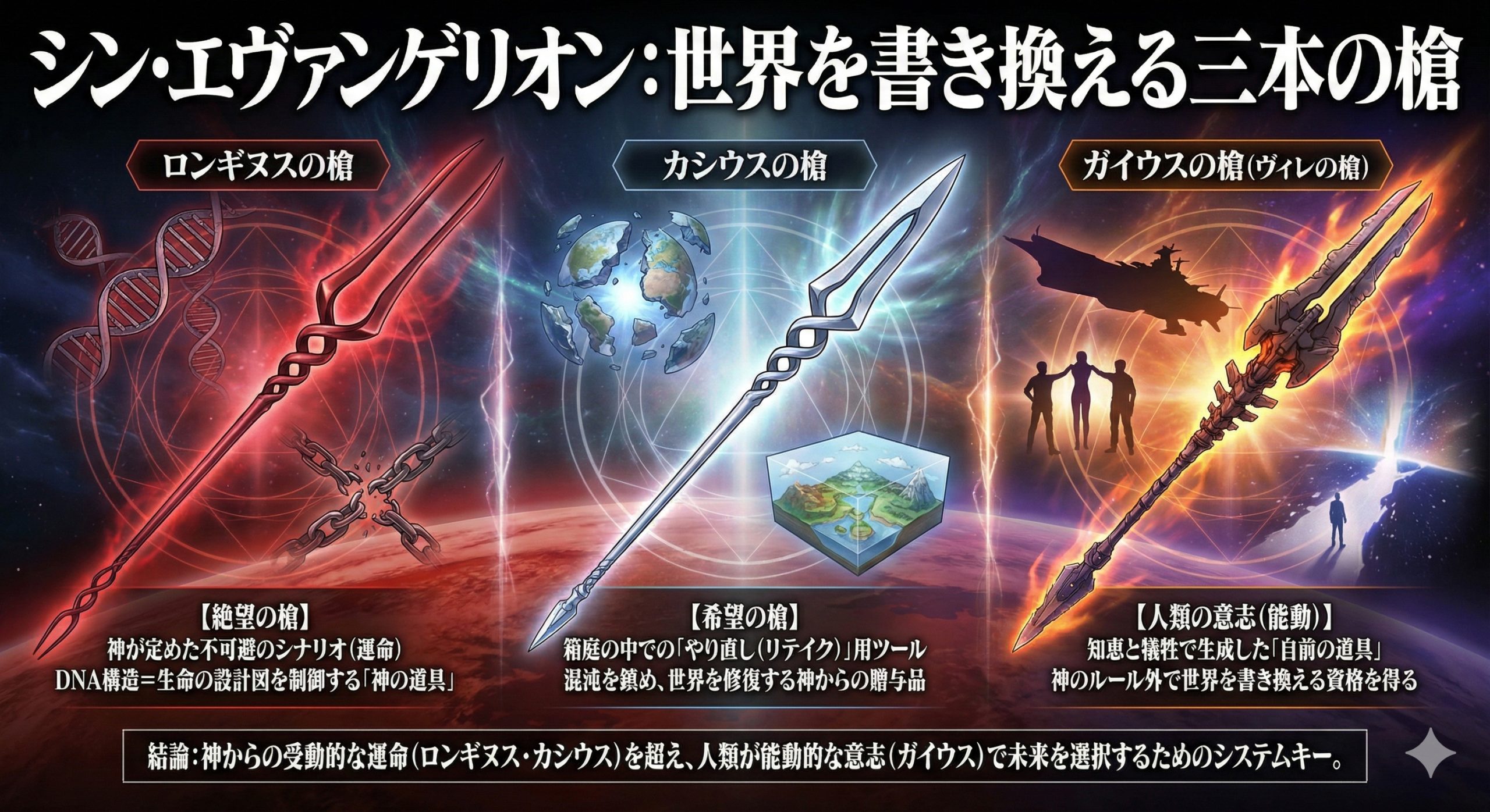 劇中での「ロンギヌスの槍」は、この「神の執行官」としての側面と、生命進化を強制的にリセットする決定論的な力を象徴しています。